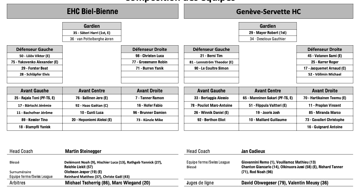Formation des équipes et joueurs indisponibles pour le match Bienne vs Genève 09/03/2024 Follow SwissHabs Derniers articles Il y a 32 minutes Simas Ignatavicius, itinéraire d’un enfant drafté Il y a 4 heures Les Swiss Devils célèbrent la cuisine helvète au New Jersey Il y a 5 heures Un match de suspension et une amende contre Jakob Lee Il y a 6 heures Davos et Fribourg joueront la ligue des champions Il y a 6 heures Ouverture d'une procédure ordinaire contre Malte Strömwall