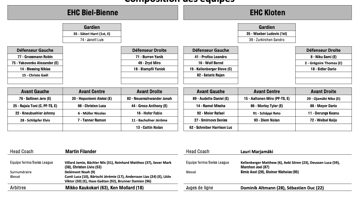 Formation des équipes et joueurs indisponibles pour le match Bienne vs Kloten 07/12/2024 Follow SwissHabs Derniers articles Il y a 3 heures Les Sharks prolongent l'attaquant Kiefer Sherwood pour cinq ans Il y a 4 heures Tyler Myers à Dallas Il y a 5 heures Le point sur l'effectif de Lugano Il y a 7 heures Ambri prolonge Jussi Tapola et signe Petr Kodytek Il y a 8 heures Robin Grossmann manquera les derniers matchs de la saison régulière