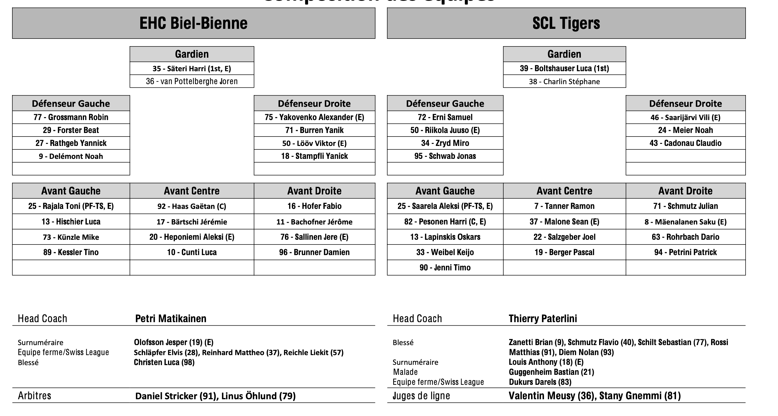 Formation des équipes et joueurs indisponibles pour le match Bienne vs Langnau 28/01/2024 Follow SwissHabs Derniers articles Il y a 40 minutes Tyler Myers à Dallas Il y a une heure Le point sur l'effectif de Lugano Il y a 3 heures Ambri prolonge Jussi Tapola et signe Petr Kodytek Il y a 4 heures Robin Grossmann manquera les derniers matchs de la saison régulière Il y a 5 heures Le masque de Remo Giovannini dans les détails