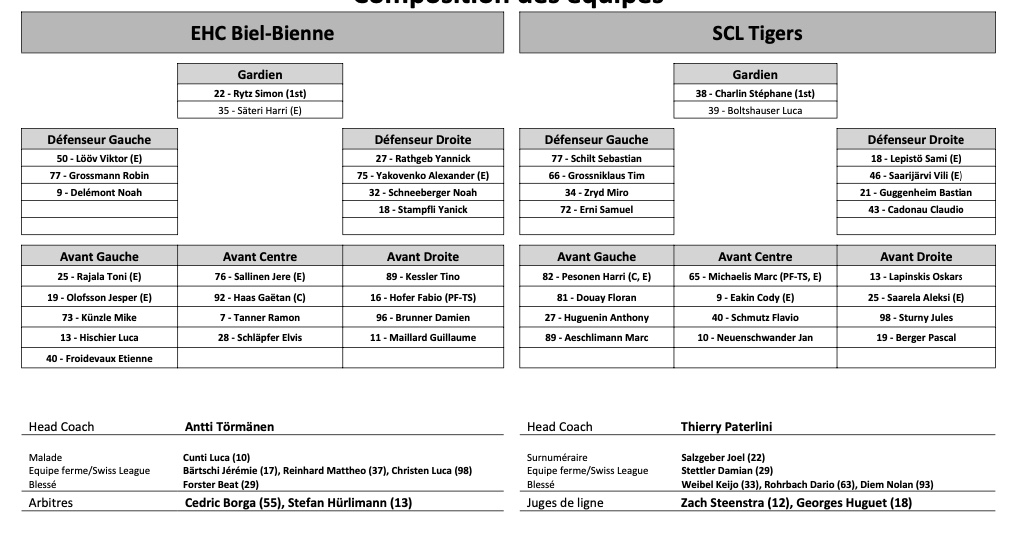 Formation des équipes et joueurs indisponibles pour le match Bienne vs Langnau 28/10/2022 Follow SwissHabs Derniers articles Il y a 37 minutes Formation des équipes et joueurs indisponibles pour le match Zurich vs Genève Il y a 44 minutes Formation des équipes et joueurs indisponibles pour le match Davos vs Kloten Il y a 46 minutes Formation des équipes et joueurs indisponibles pour le match Lugano vs Lausanne Il y a 48 minutes Formation des équipes et joueurs indisponibles pour le match Langnau vs Rapperswil Il y a 50 minutes Formation des équipes et joueurs indisponibles pour le match Zoug vs Ambri