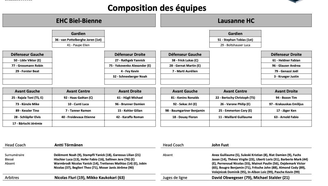 Formation des équipes et joueurs indisponibles pour le match Bienne vs Lausanne 15/10/2021 Follow SwissHabs Derniers articles Il y a 14 minutes Kay Schweri pourrait retrouver les montagnes neuchâteloises Il y a 33 minutes NHL : deux autres équipes éliminées de la course aux play-offs Il y a 39 minutes Patrick Kane signe le record de meilleur pointeur américain de NHL Il y a 52 minutes Christian Kirsch et les Rangers balaient leur série Il y a une heure Bonne opération pour les Devils