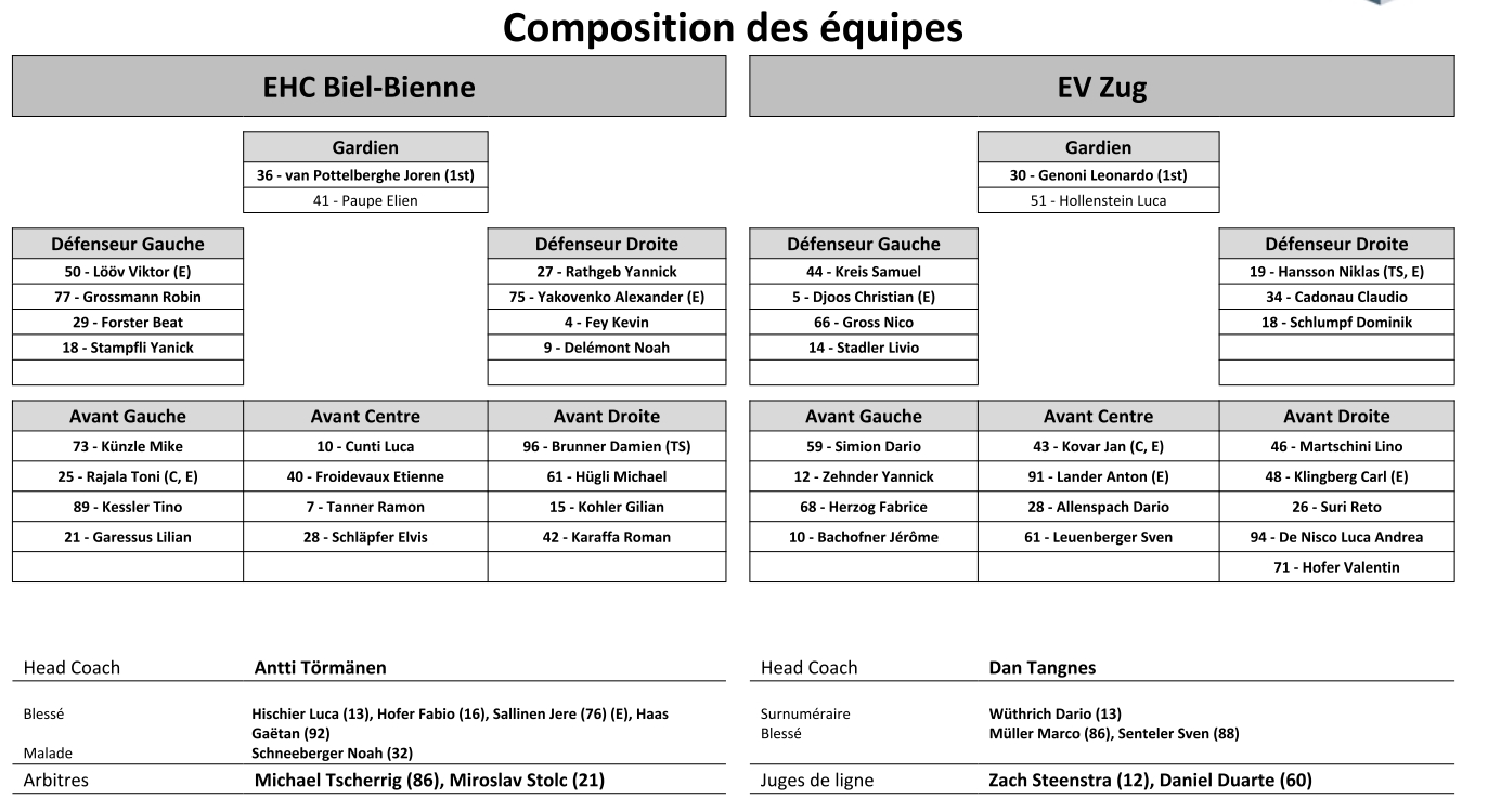 Formation des équipes et joueurs indisponibles pour le match Bienne vs Zoug 02/10/2021 Follow SwissHabs Derniers articles Il y a 50 minutes Cas Nemeth : le Tribunal du Sport de la Fédération rejette l’appel Il y a une heure Deux officialisations de contrat attendues du côté d'Ambri Il y a 2 heures Un avenir très incertain pour Denis Hollenstein Il y a 3 heures Plusieurs mouvements encore attendus autour du HC Bienne, mais Lucas Wallmark n'est pas concerné Il y a 4 heures Deux points pour Pius Suter dans la victoire des Blues