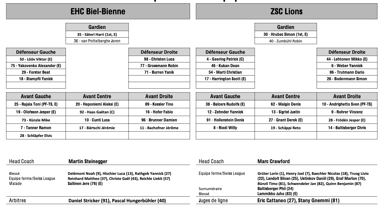 Formation des équipes et joueurs indisponibles pour le match Bienne vs Zurich 18/03/2024 Follow SwissHabs Derniers articles Il y a 3 heures Zoug dévoile son nouveau logo Il y a 3 heures Deux prolongations à Zurich Il y a 5 heures Formation des équipes et joueurs indisponibles pour le match Zurich vs Genève Il y a 5 heures Formation des équipes et joueurs indisponibles pour le match Davos vs Kloten Il y a 5 heures Formation des équipes et joueurs indisponibles pour le match Lugano vs Lausanne