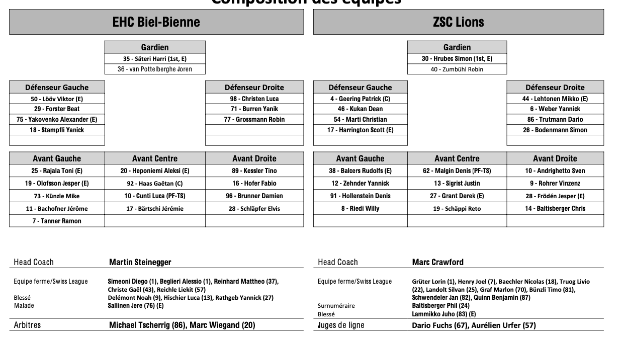 Formation des équipes et joueurs indisponibles pour le match Bienne vs Zurich 22/03/2024 Follow SwissHabs Derniers articles Il y a 3 heures Ludvig Johnson échange régulièrement avec sa franchise de NHL Il y a 4 heures EHC Coire : Björn Gerhard a une vision claire pour l'avenir de la Swiss League Il y a 5 heures Les autres faits à retenir de cette nuit de NHL et de celle à venir Il y a 5 heures Un nouveau record d'affluence pour un match féminin aux États-Unis Il y a 6 heures Lars Steiner et Guus Van der Kaaij trouvent le fond des filets