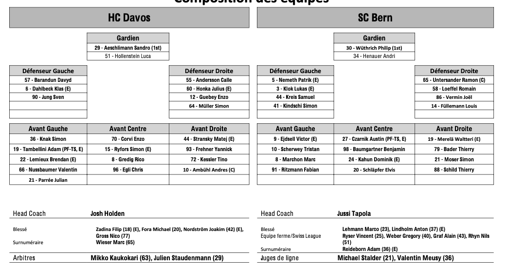 Formation des équipes et joueurs indisponibles pour le match Davos vs Berne 11/01/2025 Follow SwissHabs Derniers articles Il y a 5 heures Plusieurs joueurs touchés du côté de Davos Il y a 6 heures Kevin Fiala aura un nouveau coach Il y a 7 heures Pavel Rosa restera lui aussi derrière le banc du CP Berne Il y a 9 heures Simas Ignatavicius, itinéraire d’un enfant drafté Il y a 13 heures Les Swiss Devils célèbrent la cuisine helvète au New Jersey