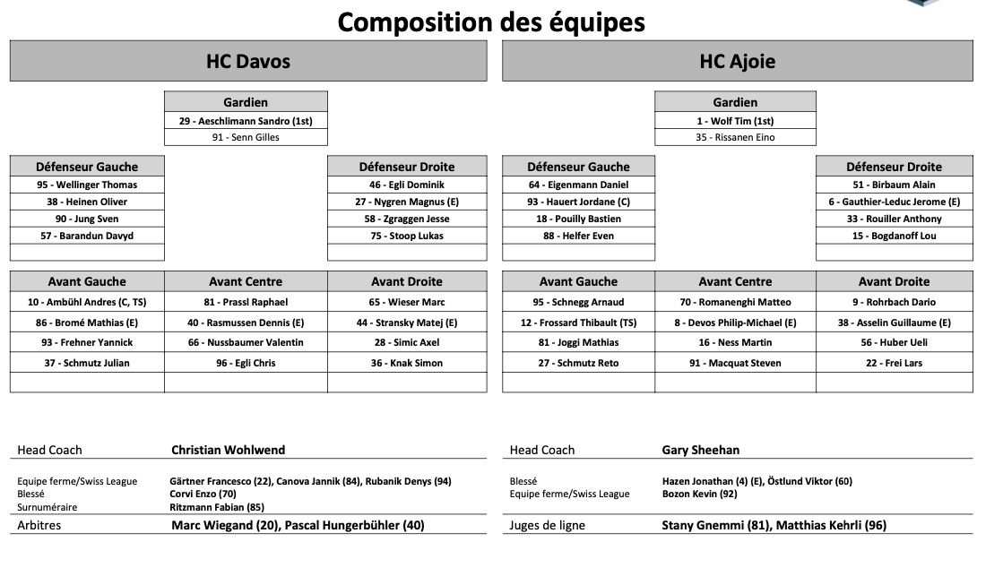 Formation des équipes et joueurs indisponibles pour le match Davos vs Ajoie 03/10/2021 Follow SwissHabs Derniers articles Il y a 59 minutes Plusieurs mouvements encore attendus autour du HC Bienne, mais Lucas Wallmark n'est pas concerné Il y a une heure Deux points pour Pius Suter dans la victoire des Blues Il y a une heure Fin de saison pour plusieurs joueurs de NHL Il y a 2 heures Huit minutes sans gardien et sans encaisser de but Il y a 2 heures Maxime Sauthier prolonge la saison des Eagles, celle de David Bosson est terminée