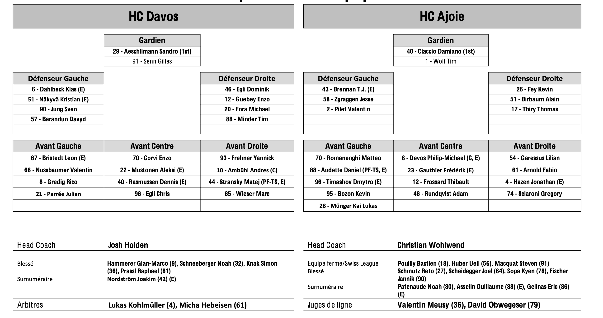 Formation des équipes et joueurs indisponibles pour le match Davos vs Ajoie 27/02/2024 Follow SwissHabs Derniers articles Il y a une heure Comment Sierre prépare son éventuelle promotion en National League Il y a 2 heures Les Lakers vivront également un week-end important dans les urnes Il y a 2 heures La Chaux-de-Fonds lance un programme de soutien pour viser la National League Il y a 3 heures Suspension provisionnelle et ouverture d'une procédure contre Loïc In-Albon Il y a 5 heures Les Lausannoises évolueront en PostFinance Women’s League