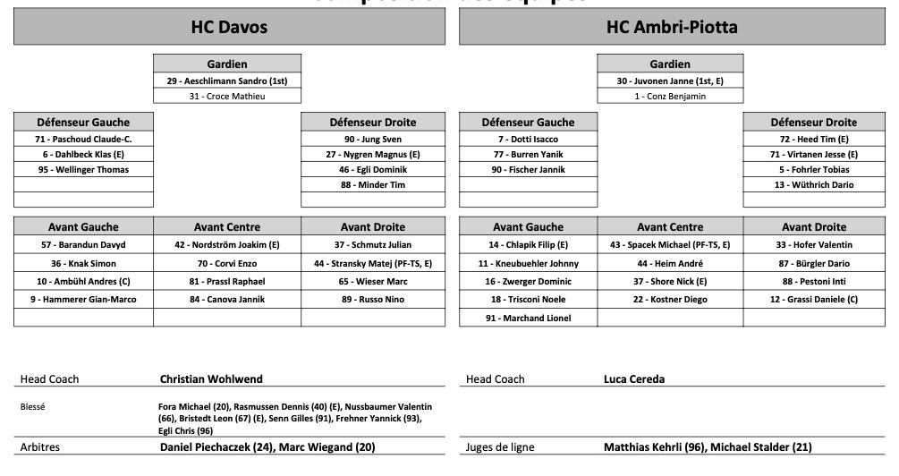 Formation des équipes et joueurs indisponibles pour le match Davos vs Ambri 25/10/2022 Follow SwissHabs Derniers articles Il y a 5 heures Zoug dévoile son nouveau logo Il y a 5 heures Deux prolongations à Zurich Il y a 7 heures Formation des équipes et joueurs indisponibles pour le match Zurich vs Genève Il y a 7 heures Formation des équipes et joueurs indisponibles pour le match Davos vs Kloten Il y a 7 heures Formation des équipes et joueurs indisponibles pour le match Lugano vs Lausanne