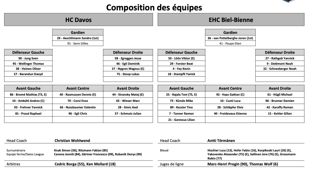 Formation des équipes et joueurs indisponibles pour le match Davos vs Bienne 30/10/2021 Follow SwissHabs Derniers articles Il y a 4 heures Formation des équipes et joueurs indisponibles pour le match Fribourg vs Rapperswil Il y a 6 heures Nicole Vallario prend du gallon à New-York, Kira Juodikis rejoint l'équipe Il y a 10 heures Mathieu Maret rejoint Martigny Il y a 11 heures Toujours l'incertitude autour d'Enzo Corvi Il y a 11 heures Un nouvel heureux événement pour Kevin Fiala et sa famille