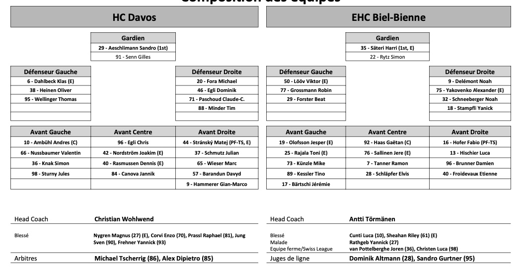 Formation des équipes et joueurs indisponibles pour le match Davos vs Bienne 31/01/2023 Follow SwissHabs Derniers articles Il y a 27 minutes Christian Dubé fait le point sur ses débuts avec le HC Bienne Il y a 53 minutes Le combat de Jason Zucker vs Jonas Siegenthaler en images Il y a 2 heures Ian Michtell devrait rejoindre Berne la saison prochaine Il y a 6 heures Le point sur l'infirmerie du HC Bienne Il y a 7 heures Trois nouveaux intronisés au Hall of Fame de Genève
