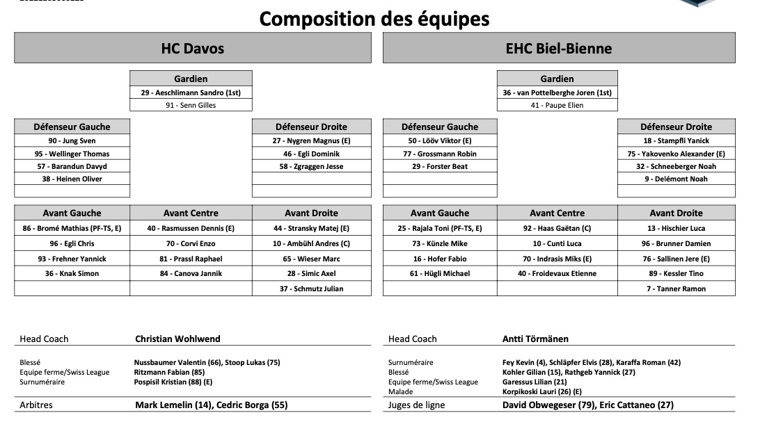 Formation des équipes et joueurs indisponibles pour le match Davos vs Bienne 02/03/2022 Follow SwissHabs Derniers articles Il y a 3 heures Un reportage sur Fribourg et Genève avant les play-offs Il y a 5 heures Deux joueurs de Fribourg qui pourraient remplacer Jonathan Dahlén en Suède Il y a 6 heures Petri Matikainen meilleur coach de Finlande, Antti Raanta plus gros flop Il y a 7 heures Une récolte de fonds pour le fils de Garry Nunn Il y a 9 heures EHC Bâle : Deux figures emblématiques raccrochent les patins