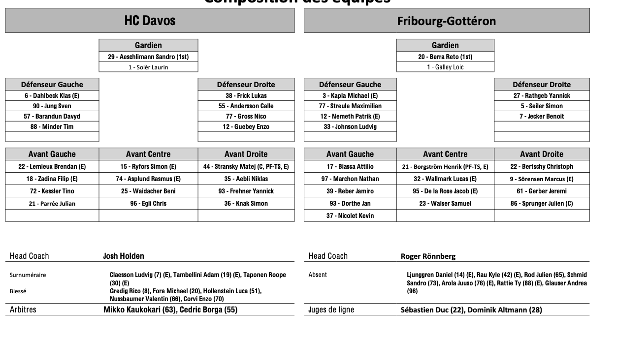 Formation des équipes et joueurs indisponibles pour le match Davos vs Fribourg 18/04/2026 Follow SwissHabs Derniers articles Il y a une heure Formation des équipes et joueurs indisponibles pour le match Davos vs Fribourg Il y a 2 heures Luca Fazzini pour très longtemps à Lugano Il y a 3 heures Le responsable merchandising du Mammoth de l'Utah va se faire taper sur les doigts Il y a 6 heures Victor Söderström s'est bien engagé en Suisse Il y a 8 heures Les Lakers prennent congé de leurs joueurs partant