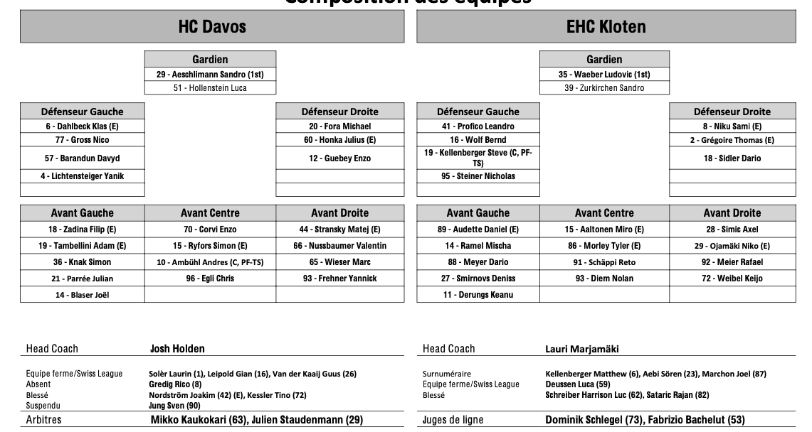 Formation des équipes et joueurs indisponibles pour le match Davos vs Kloten 17/09/2024 Follow SwissHabs Derniers articles Il y a 3 heures La saison de NHL de Nino Niederreiter serait terminée Il y a 3 heures Les images des matchs de la soirée en National League Il y a 9 heures Formation des équipes et joueurs indisponibles pour le match Bienne vs Zoug Il y a 9 heures Formation des équipes et joueurs indisponibles pour le match Rapperswil vs Fribourg Il y a 9 heures Formation des équipes et joueurs indisponibles pour le match Kloten vs Langnau