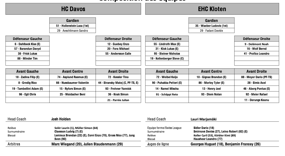 Formation des équipes et joueurs indisponibles pour le match Davos vs Kloten 28/02/2026 Follow SwissHabs Derniers articles Il y a une heure Formation des équipes et joueurs indisponibles pour le match Zurich vs Genève Il y a une heure Formation des équipes et joueurs indisponibles pour le match Davos vs Kloten Il y a une heure Formation des équipes et joueurs indisponibles pour le match Lugano vs Lausanne Il y a une heure Formation des équipes et joueurs indisponibles pour le match Langnau vs Rapperswil Il y a 2 heures Formation des équipes et joueurs indisponibles pour le match Zoug vs Ambri