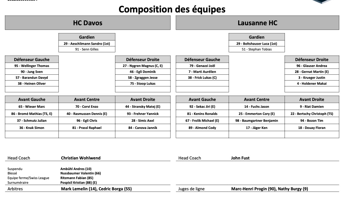 Formation des équipes et joueurs indisponibles pour le match Davos vs Lausanne 21/01/2022 Follow SwissHabs Derniers articles Il y a 30 minutes Formation des équipes et joueurs indisponibles pour le match Lugano vs Zurich Il y a 31 minutes Formation des équipes et joueurs indisponibles pour le match Lausanne vs Genève Il y a une heure Martigny ne compte pas stagner en 1ère ligue trop longtemps Il y a 2 heures Trois contrats d'entrée paraphés en NHL Il y a 4 heures Les Hurricanes et le Kraken se rendront à Helsinki pour la NHL Global Series