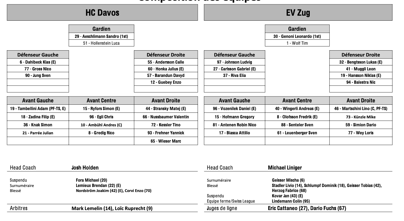 Formation des équipes et joueurs indisponibles pour le match Davos vs Zoug 11/02/2025 Follow SwissHabs Derniers articles Il y a une heure Women's League : début des pré-play-offs, les play-out n’auront pas lieu Il y a une heure Les autres faits à retenir de cette nuit de NHL et de celle à venir Il y a 2 heures Connor McDavid atteint les 100 points pour une sixième saison consécutive Il y a 2 heures Benoît Groulx n'exclu pas de prolonger avec Zoug Il y a 3 heures Une courte absence pour Damiano Ciaccio