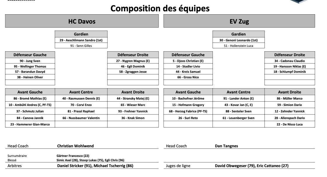 Formation des équipes et joueurs indisponibles pour le match Davos vs Zoug 10/04/2022 Follow SwissHabs Derniers articles Il y a 35 minutes Quelques changements au HC Bienne également Il y a 49 minutes Le point sur l'effectif du HC Kloten, Reto Berra dans une vision à long terme Il y a 3 heures Trois signatures cette nuit en NHL Il y a 3 heures Alina Müller atteint les 50 points en PWHL Il y a 4 heures Les Suisses d'OHL victorieux