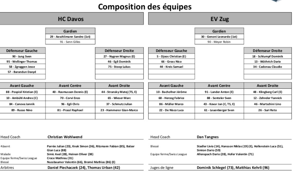 Formation des équipes et joueurs indisponibles pour le match Davos vs Zoug 22/12/2021 Follow SwissHabs Derniers articles Il y a 40 minutes Le HC Kloten complète son staff d'entraîneurs pour la saison à venir Il y a 42 minutes Marcel Jenni assistera également Jan Cadieux Il y a une heure Jiri Felcman a signé son contrat d'entrée avec les Blackhawks Il y a 3 heures Red Bull va s'investir encore plus dans le hockey suisse Il y a 5 heures Marcus Sörensen optimiste pour la suite des play-offs