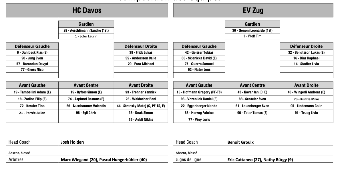 Formation des équipes et joueurs indisponibles pour le match Davos vs Zoug 28/03/2026 Follow SwissHabs Derniers articles Il y a une heure Formation des équipes et joueurs indisponibles pour le match Ambri vs Ajoie Il y a une heure Formation des équipes et joueurs indisponibles pour le match Fribourg vs Rapperswil Il y a une heure Formation des équipes et joueurs indisponibles pour le match Davos vs Zoug Il y a 3 heures Fin de carrière pour Linus Klasen ? Il y a 5 heures Victor Ejdsell va rejoindre Färjestad
