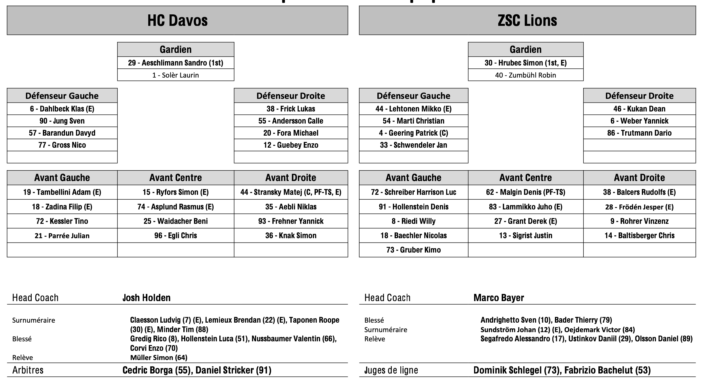 Formation des équipes et joueurs indisponibles pour le match Davos vs Zurich 04/04/2026 Follow SwissHabs Derniers articles Il y a 48 minutes Les faits à surveiller pour cette prochaine soirée de NHL Il y a 2 heures Formation des équipes et joueurs indisponibles pour le match Fribourg vs Genève Il y a 2 heures Formation des équipes et joueurs indisponibles pour le match Davos vs Zurich Il y a 3 heures Finale de Swiss League acte IV : formation des équipes et joueurs indisponibles pour le match La Chaux-de-Fonds vs Sierre Il y a 5 heures Nicolas Müller rejoindra les bords du Léman