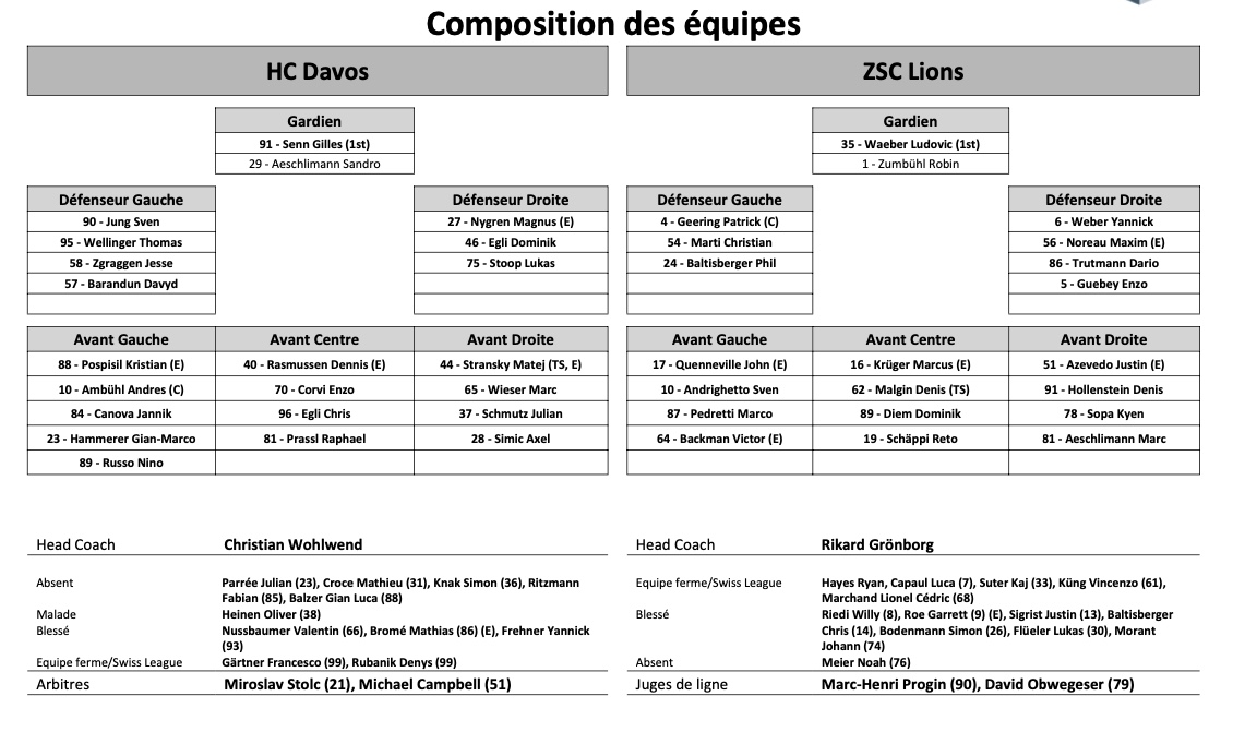 Formation des équipes et joueurs indisponibles pour le match Davos vs Zurich 19/12/2021 Follow SwissHabs Derniers articles Il y a 4 heures National League : Zurich file en demi-finale, Genève reprend l'avantage de la glace Il y a 4 heures Swiss League : une finale entre Sierre et la Chaux-de-Fonds Il y a 8 heures Lino Martschini vise un nouveau contrat après sa grave blessure Il y a 8 heures Formation des équipes et joueurs indisponibles pour le match Lausanne vs Genève Il y a 9 heures Formation des équipes et joueurs indisponibles pour le match Lugano vs Zurich