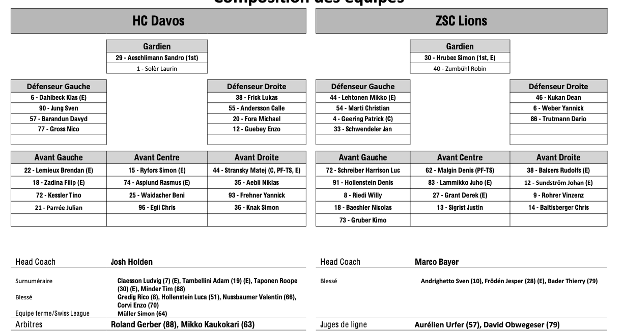 Formation des équipes et joueurs indisponibles pour le match Davos vs Zurich 08/04/2026 Follow SwissHabs Derniers articles Il y a 53 minutes Les plus beaux arrêts de la dernière semaine de NHL Il y a 2 heures Formation des équipes et joueurs indisponibles pour le match Fribourg vs Genève Il y a 2 heures Formation des équipes et joueurs indisponibles pour le match Davos vs Zurich Il y a 4 heures Akira Schmid parmi les nominés pour le trophée Bill Masterton Il y a 4 heures Début de la préparation pour les Mondiaux : première sélection de Patrick Fischer