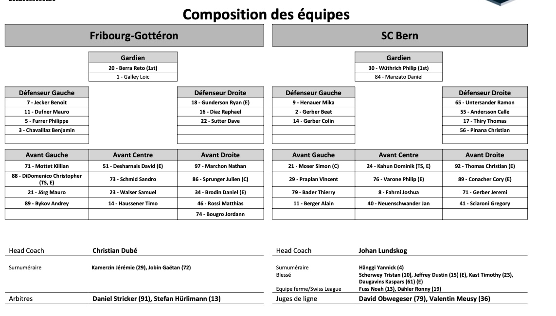 Formation des équipes et joueurs indisponibles pour le match Fribourg vs Berne 18/01/2022 Follow SwissHabs Derniers articles Il y a 2 heures Resumé des matchs de la soirée en National League Il y a 7 heures Formation des équipes et joueurs indisponibles pour le match Lugano vs Zurich Il y a 7 heures Formation des équipes et joueurs indisponibles pour le match Lausanne vs Genève Il y a 8 heures Martigny ne compte pas stagner en 1ère ligue trop longtemps Il y a 9 heures Trois contrats d'entrée paraphés en NHL