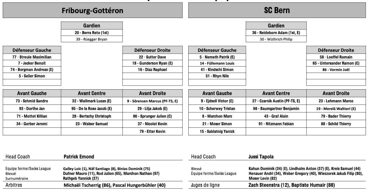 Formation des équipes et joueurs indisponibles pour le match Fribourg vs Berne 15/11/2024 Follow SwissHabs Derniers articles Il y a 56 minutes Quelques semaines d'absence pour Dominic Zwerger Il y a 2 heures Les autres faits à retenir de cette nuit de NHL et de celle à venir Il y a 5 heures Fribourg a pu profiter de la vente de feu de Jukurit Il y a 5 heures Un record pour les Stars de Dallas Il y a 5 heures Les Devils s'imposent mais notre trio suisse reste muet