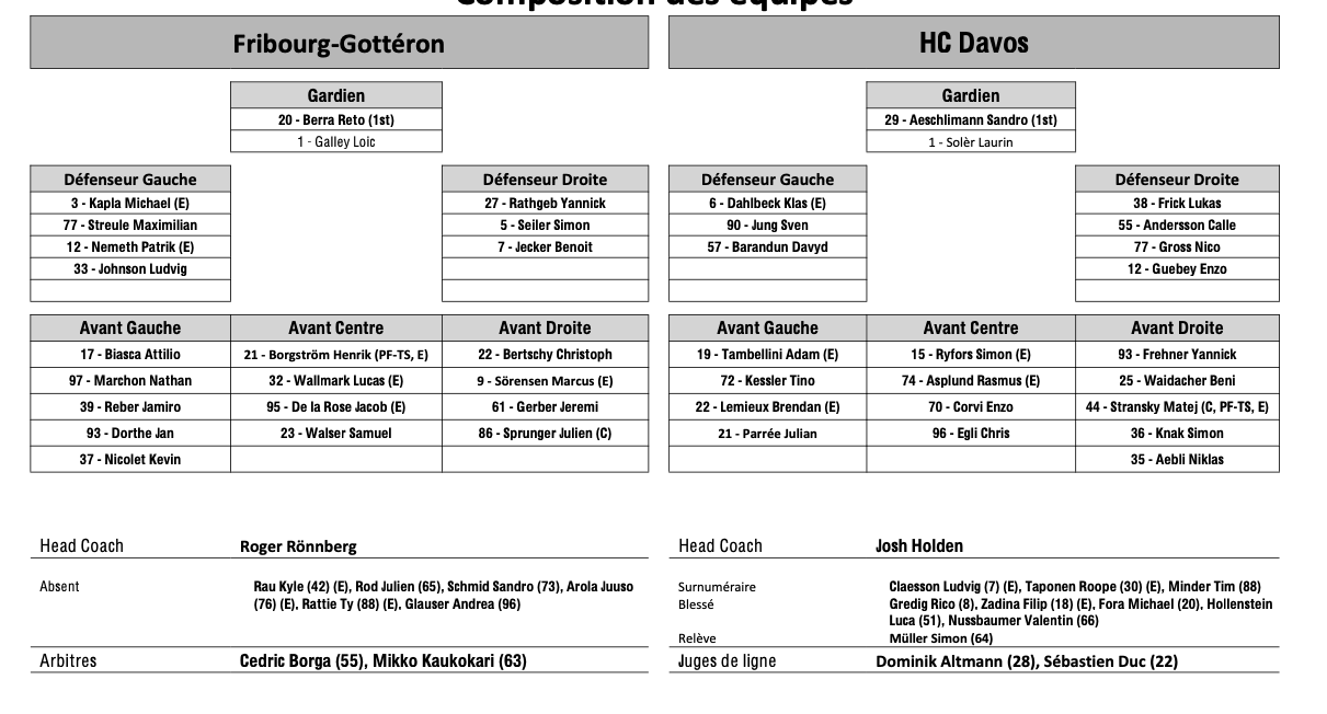 Formation des équipes et joueurs indisponibles pour le match Fribourg vs Davos 24/04/2026 Follow SwissHabs Derniers articles Il y a une heure Formation des équipes et joueurs indisponibles pour le match Suisse - Hongrie Il y a une heure Formation des équipes et joueurs indisponibles pour le match Fribourg vs Davos Il y a une heure Mondiaux U18 : la Suisse fête sa promotion avec un quasi sans faute Il y a 2 heures Une qualification et un hôte de marque pour Leon Muggli et les Bears Il y a 3 heures Les frères Krayem prolongent l'aventure avec le SC Langenthal