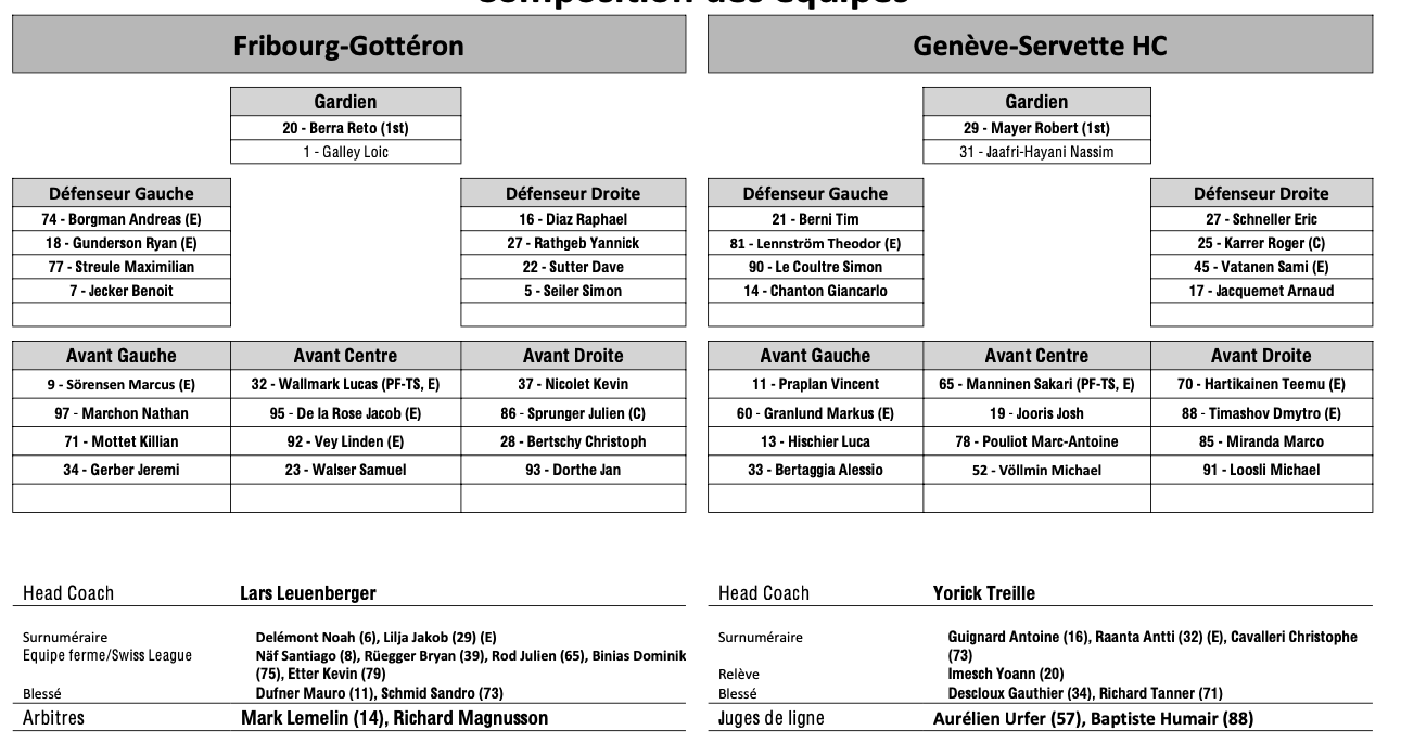 Formation des équipes et joueurs indisponibles pour le match Fribourg vs Genève 22/02/2025 Follow SwissHabs Derniers articles Il y a une heure Fribourg-Gottéron engage un nouvel étranger Il y a 4 heures Colin Lindemann prolonge son contrat avec Zoug jusqu'en 2028 Il y a 4 heures Jannik Fischer prendra sa retraite à la fin de la saison Il y a 4 heures Reto Berra de retour sur la glace Il y a 4 heures Langnau devenait champion suisse il y bientôt 50 ans