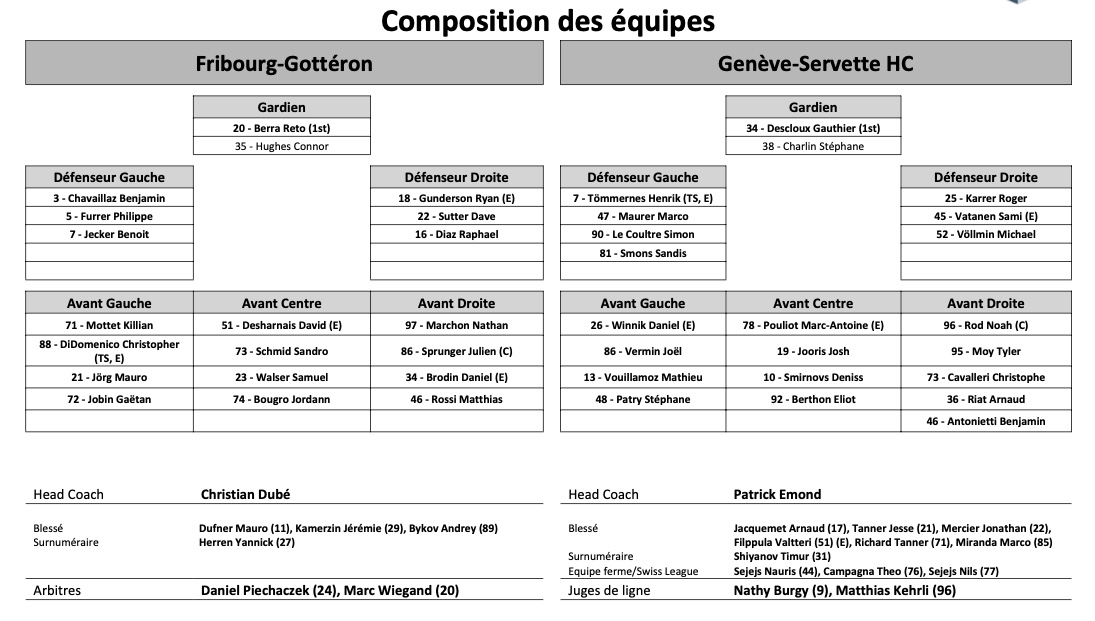 Formation des équipes et joueurs indisponibles pour le match Fribourg vs Genève 05/11/2021 Follow SwissHabs Derniers articles Il y a 3 heures Les autres faits à retenir de cette nuit de NHL Il y a 3 heures Ovechkin défie le temps et entre encore dans l’histoire Il y a 4 heures Un rare combat de gardiens en NHL Il y a 4 heures Le point sur les play-offs de Canadian Hockey League Il y a 4 heures Une soirée à oublier pour nos Suisses de NHL