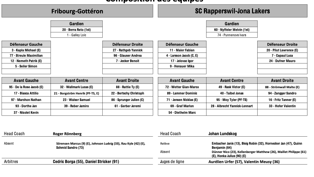 Formation des équipes et joueurs indisponibles pour le match Fribourg vs Rapperswil 20/03/2026 Follow SwissHabs Derniers articles Il y a une heure Formation des équipes et joueurs indisponibles pour le match Fribourg vs Rapperswil Il y a une heure Formation des équipes et joueurs indisponibles pour le match Davos vs Zoug Il y a 2 heures Petite précision sur le contrat d'Henrik Borgström Il y a 3 heures Plusieurs licences B du côté de Genève Il y a 4 heures Cédric Hächler tire sa révérence