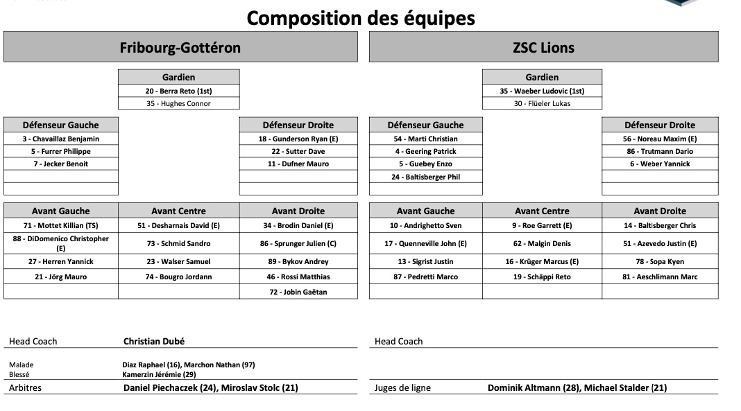 Formation des équipes et joueurs indisponibles pour le match Fribourg vs Zurich 25/09/2021 Follow SwissHabs Derniers articles Il y a une heure Les Islanders changent de cap : Peter DeBoer remplace Patrick Roy Il y a 7 heures Des sanctions contre Sandro Aeschlimann, Igor Jelovac, Marlon Graf et Julien Sprunger Il y a 8 heures Chris McSorley et Genève-Servette renvoyés dos à dos Il y a 9 heures Nicole Vallario et les Sirens jouent devant 18'000 fans dans une arène mythique Il y a 11 heures Andres Ambühl va prendre une place importante dans la Coupe Spengler