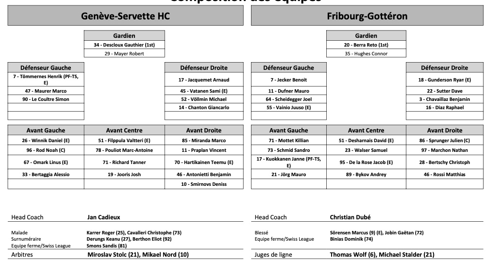 Formation des équipes et joueurs indisponibles pour le match Genève vs Fribourg 30/09/2022 Follow SwissHabs Derniers articles Il y a 33 minutes Les autres faits à retenir de cette nuit de NHL et de celle à venir Il y a 58 minutes Un nouveau record d'affluence pour un match féminin aux États-Unis Il y a une heure Lars Steiner et Guus Van der Kaaij trouvent le fond des filets Il y a une heure Akira Schmid et les Golden Knights défaits par les Capitals Il y a 8 heures La saison de NHL de Nino Niederreiter serait terminée
