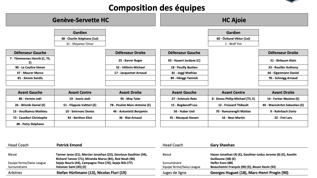 Formation des équipes et joueurs indisponibles pour le match Genève vs Ajoie 06/11/2021 Follow SwissHabs Derniers articles Il y a 46 minutes Les autres faits à retenir de cette nuit de NHL Il y a 47 minutes Ovechkin défie le temps et entre encore dans l’histoire Il y a une heure Un rare combat de gardiens en NHL Il y a une heure Le point sur les play-offs de Canadian Hockey League Il y a une heure Une soirée à oublier pour nos Suisses de NHL