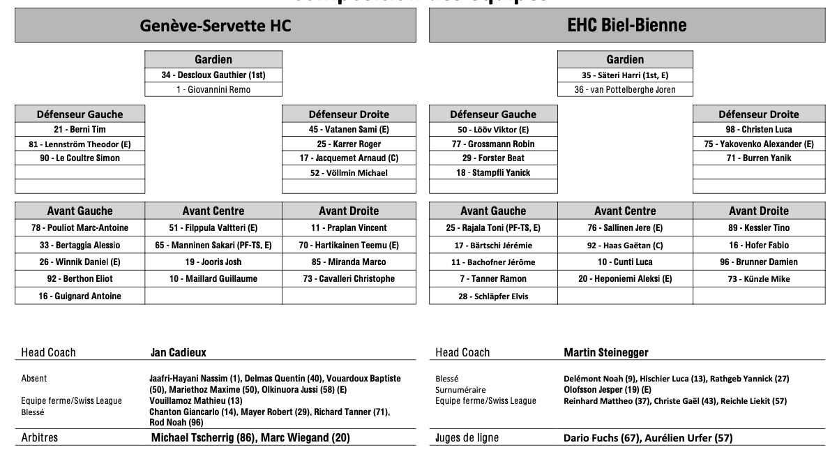 Formation des équipes et joueurs indisponibles pour le match Genève vs Bienne 04/03/2024 Follow SwissHabs Derniers articles Il y a 6 heures Plusieurs joueurs touchés du côté de Davos Il y a 8 heures Kevin Fiala aura un nouveau coach Il y a 9 heures Pavel Rosa restera lui aussi derrière le banc du CP Berne Il y a 11 heures Simas Ignatavicius, itinéraire d’un enfant drafté Il y a 14 heures Les Swiss Devils célèbrent la cuisine helvète au New Jersey