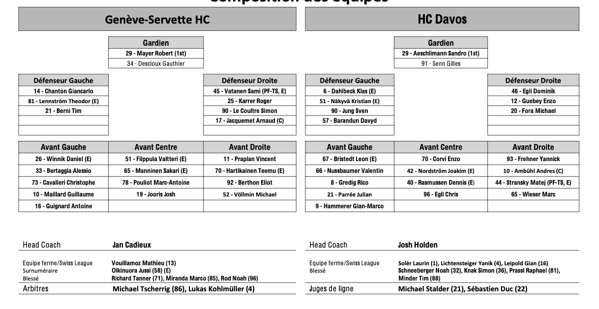 Formation des équipes et joueurs indisponibles pour le match Genève vs Davos 16/02/2024 Follow SwissHabs Derniers articles Il y a 3 minutes Saison terminée pour Luca Hollenstein, un remplaçant déjà trouvé Il y a 25 minutes Coire prolonge son buteur Liekit Reichle Il y a 2 heures Les autres faits à retenir de cette nuit de NHL et de celle à venir Il y a 2 heures U18-Elit et U21-Elit : début des play-offs et du tour de classement Il y a 4 heures Un doublé et une première étoile pour Lian Bichsel