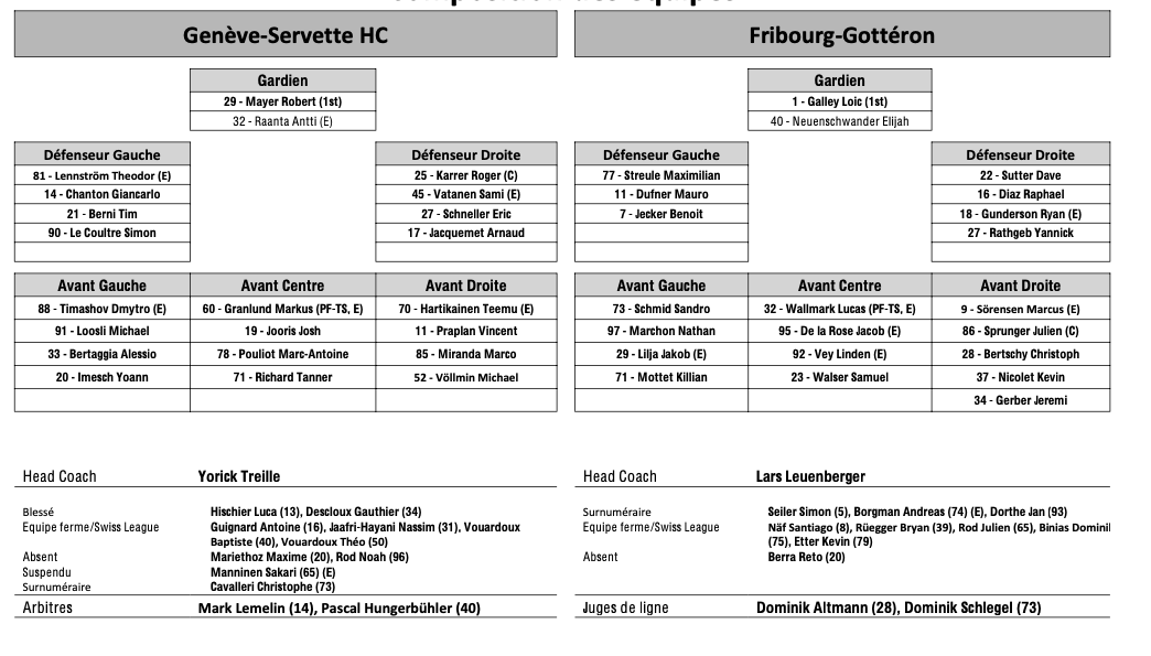 Formation des équipes et joueurs indisponibles pour le match Genève vs Fribourg 11/01/2025 Follow SwissHabs Derniers articles Il y a 5 heures Plusieurs joueurs touchés du côté de Davos Il y a 6 heures Kevin Fiala aura un nouveau coach Il y a 7 heures Pavel Rosa restera lui aussi derrière le banc du CP Berne Il y a 9 heures Simas Ignatavicius, itinéraire d’un enfant drafté Il y a 13 heures Les Swiss Devils célèbrent la cuisine helvète au New Jersey