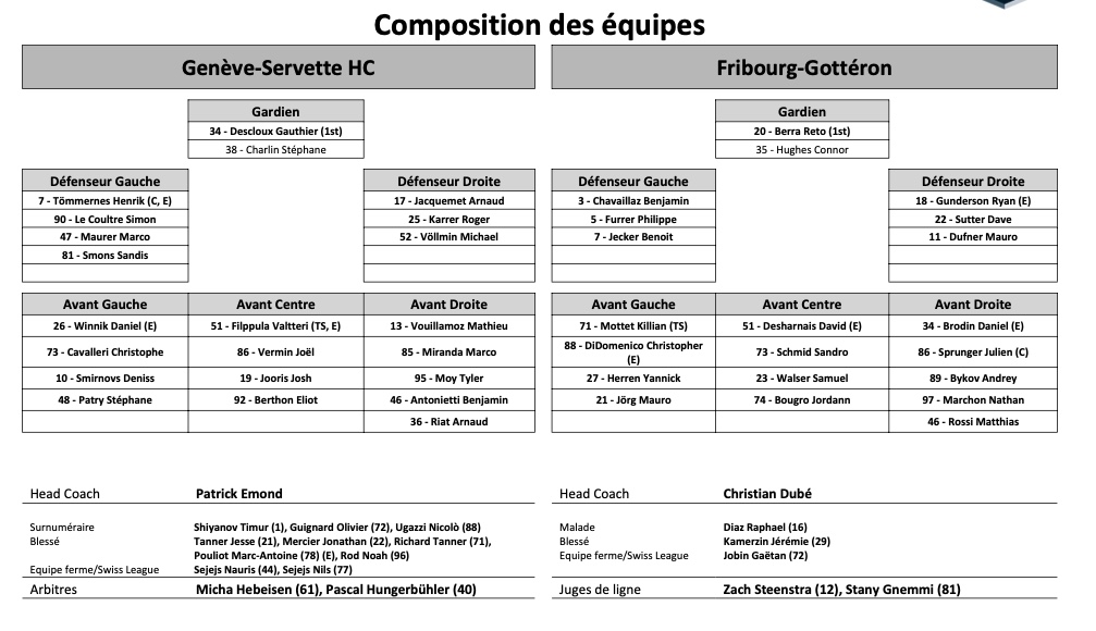 Formation des équipes et joueurs indisponibles pour le match Genève vs Fribourg 24/09/2021 Follow SwissHabs Derniers articles Il y a 2 heures Les Islanders changent de cap : Peter DeBoer remplace Patrick Roy Il y a 8 heures Des sanctions contre Sandro Aeschlimann, Igor Jelovac, Marlon Graf et Julien Sprunger Il y a 9 heures Chris McSorley et Genève-Servette renvoyés dos à dos Il y a 10 heures Nicole Vallario et les Sirens jouent devant 18'000 fans dans une arène mythique Il y a 12 heures Andres Ambühl va prendre une place importante dans la Coupe Spengler