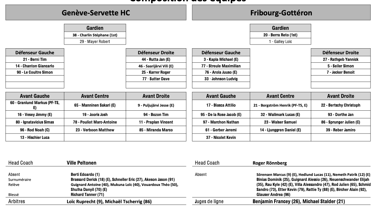 Formation des équipes et joueurs indisponibles pour le match Genève vs Fribourg 06/04/2026 Follow SwissHabs Derniers articles Il y a une heure Formation des équipes et joueurs indisponibles pour le match Genève vs Fribourg Il y a une heure Formation des équipes et joueurs indisponibles pour le match Zurich vs Davos Il y a une heure Nino Niederreiter va pouvoir retrouver le jeu Il y a 2 heures Cristobal Huet et Thomas Wiesel invités de Drette su'l tape Il y a 3 heures Finales Elites : Bienne est champion U21, Zurich U18