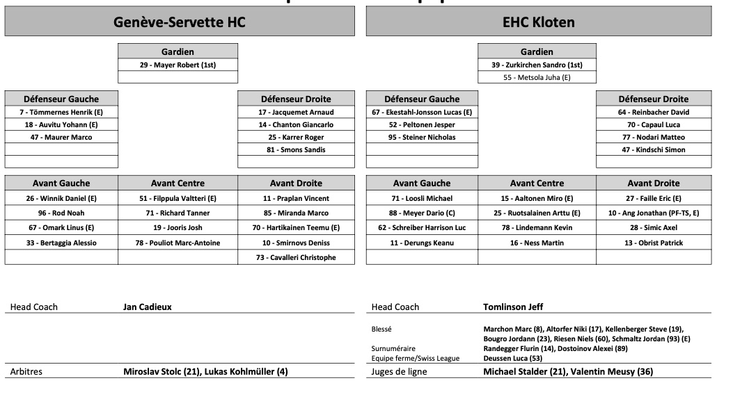 Formation des équipes et joueurs indisponibles pour le match Genève vs Kloten 28/01/2023 Follow SwissHabs Derniers articles Il y a 3 minutes Comment Sierre prépare son éventuelle promotion en National League Il y a 52 minutes Trois nouveaux intronisés au Hall of Fame de Genève Il y a 2 heures Women's League : début des pré-play-offs, les play-out n’auront pas lieu Il y a 2 heures Les autres faits à retenir de cette nuit de NHL et de celle à venir Il y a 3 heures Connor McDavid atteint les 100 points pour une sixième saison consécutive