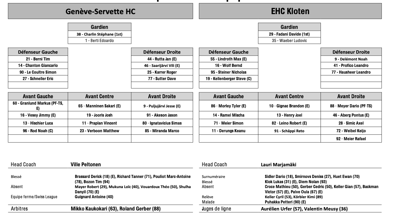 Formation des équipes et joueurs indisponibles pour le match Genève vs Kloten 09/03/2026 Follow SwissHabs Derniers articles Il y a 2 heures Formation des équipes et joueurs indisponibles pour le match Berne vs Fribourg Il y a 2 heures Formation des équipes et joueurs indisponibles pour le match Rapperswil vs Ambri Il y a 2 heures Formation des équipes et joueurs indisponibles pour le match Genève vs Kloten Il y a 2 heures Formation des équipes et joueurs indisponibles pour le match Davos vs Bienne Il y a 2 heures Formation des équipes et joueurs indisponibles pour le match Lausanne vs Ajoie
