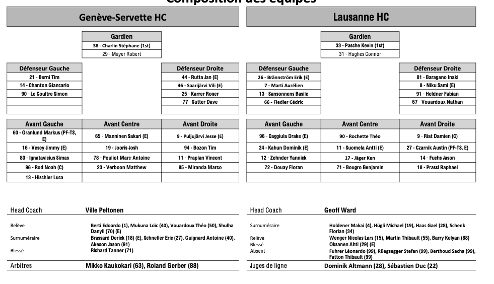 Formation des équipes et joueurs indisponibles pour le match Genève vs Lausanne 29/03/2026 Follow SwissHabs Derniers articles Il y a une heure Formation des équipes et joueurs indisponibles pour le match Genève vs Lausanne Il y a 2 heures Luc Tardif quittera la présidence de l’IIHF en octobre Il y a 4 heures Finale de Swiss League acte I : formation des équipes et joueurs indisponibles pour le match Sierre vs La Chaux-de-Fonds Il y a 6 heures « Une phase de transition » : Reto Kläy fait le point après l’élimination et se met à la quête d'un coach Il y a 7 heures Pour le plaisir : le bien joli but de Matthew Tkachuk