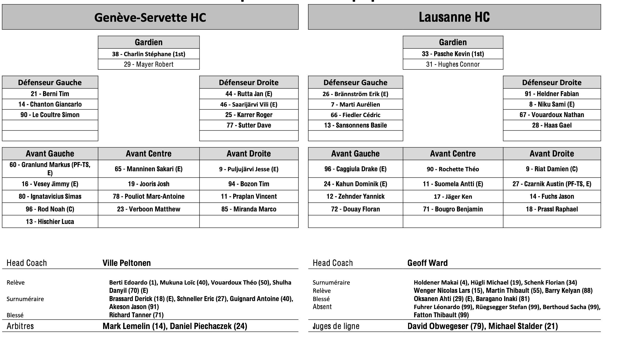 Formation des équipes et joueurs indisponibles pour le match Genève vs Lausanne 02/04/2026 Follow SwissHabs Derniers articles Il y a une heure Formation des équipes et joueurs indisponibles pour le match Genève vs Lausanne Il y a une heure Finale de Swiss League acte III : formation des équipes et joueurs indisponibles pour le match Sierre vs La Chaux-de-Fonds Il y a 2 heures L'équipe universitaire de retour pour deux ans à la Coupe Spengler Il y a 5 heures Champions Hockey League : les challengers Il y a 6 heures Victor Söderström devrait évoluer en Suisse la saison prochaine