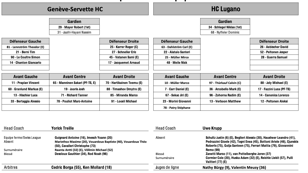 Formation des équipes et joueurs indisponibles pour le match Genève vs Lugano 11/02/2025 Follow SwissHabs Derniers articles Il y a une heure Women's League : début des pré-play-offs, les play-out n’auront pas lieu Il y a une heure Les autres faits à retenir de cette nuit de NHL et de celle à venir Il y a 2 heures Connor McDavid atteint les 100 points pour une sixième saison consécutive Il y a 2 heures Benoît Groulx n'exclu pas de prolonger avec Zoug Il y a 3 heures Une courte absence pour Damiano Ciaccio