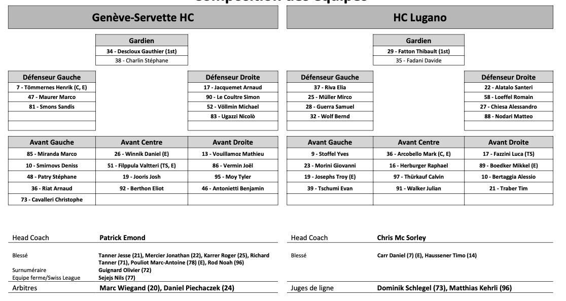 Formation des équipes et joueurs indisponibles pour le match Genève vs Lugano 18/09/2021 Follow SwissHabs Derniers articles Il y a 28 minutes Les autres faits à retenir de cette nuit de NHL et de celle à venir Il y a 45 minutes Dan Tangnes signe un bien bel exploit avec Rögle Il y a 59 minutes Une 21e saison à plus d'un point par match pour Sidney Crosby Il y a une heure Les Devils stoppent la série du Canadien Il y a une heure Saison terminée pour Maxime Sauthier, les Huskies devront passer par un septième match