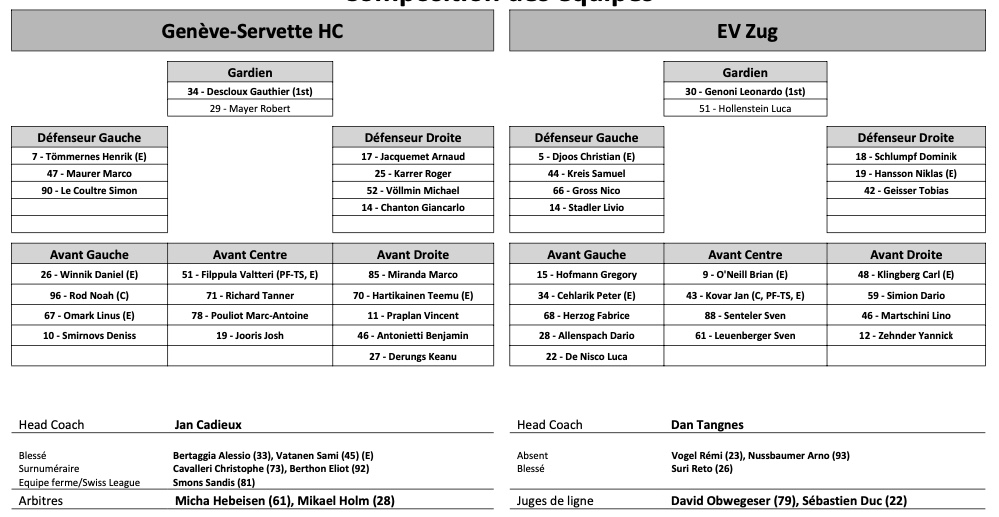 Formation des équipes et joueurs indisponibles pour le match Genève vs Zoug 25/10/2022 Follow SwissHabs Derniers articles Il y a 6 heures Zoug dévoile son nouveau logo Il y a 6 heures Deux prolongations à Zurich Il y a 9 heures Formation des équipes et joueurs indisponibles pour le match Zurich vs Genève Il y a 9 heures Formation des équipes et joueurs indisponibles pour le match Davos vs Kloten Il y a 9 heures Formation des équipes et joueurs indisponibles pour le match Lugano vs Lausanne