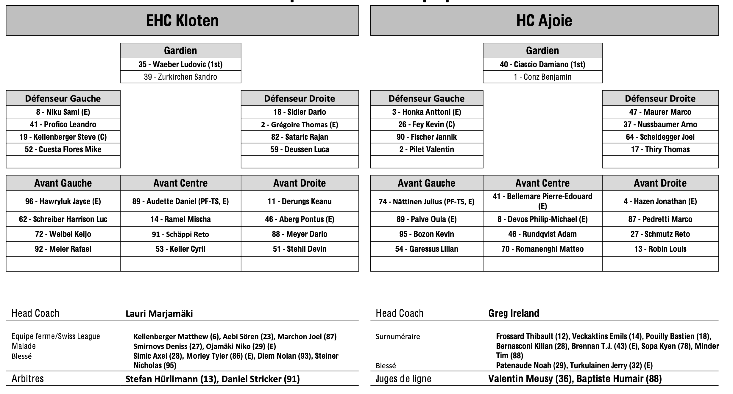 Formation des équipes et joueurs indisponibles pour le match Kloten vs Ajoie 24/01/2025 Follow SwissHabs Derniers articles Il y a une heure Zoug dévoile son nouveau logo Il y a une heure Deux prolongations à Zurich Il y a 3 heures Formation des équipes et joueurs indisponibles pour le match Zurich vs Genève Il y a 4 heures Formation des équipes et joueurs indisponibles pour le match Davos vs Kloten Il y a 4 heures Formation des équipes et joueurs indisponibles pour le match Lugano vs Lausanne