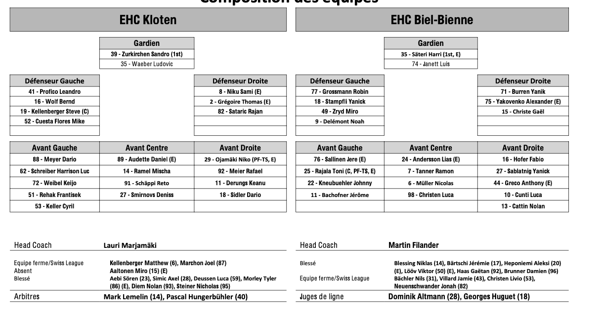 Formation des équipes et joueurs indisponibles pour le match Kloten vs Bienne 18/01/2025 Follow SwissHabs Derniers articles Il y a 47 minutes Un match de suspension et une amende contre Jakob Lee Il y a une heure Davos et Fribourg joueront la ligue des champions Il y a une heure Ouverture d'une procédure ordinaire contre Malte Strömwall Il y a 2 heures Emil Pettersson suscite de l'intérêt sur le marché suisse Il y a 3 heures Les autres faits à retenir de cette nuit de NHL et de celle à venir