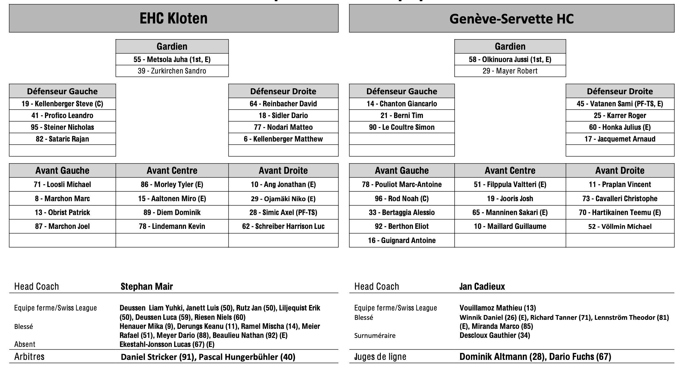 Formation des équipes et joueurs indisponibles pour le match Kloten vs Genève 30/01/2024 Follow SwissHabs Derniers articles Il y a 47 minutes Ambri prolonge Jussi Tapola et signe Petr Kodytek Il y a une heure Robin Grossmann manquera les derniers matchs de la saison régulière Il y a 2 heures Le masque de Remo Giovannini dans les détails Il y a 5 heures Quelques semaines d'absence pour Dominic Zwerger Il y a 7 heures Les autres faits à retenir de cette nuit de NHL et de celle à venir